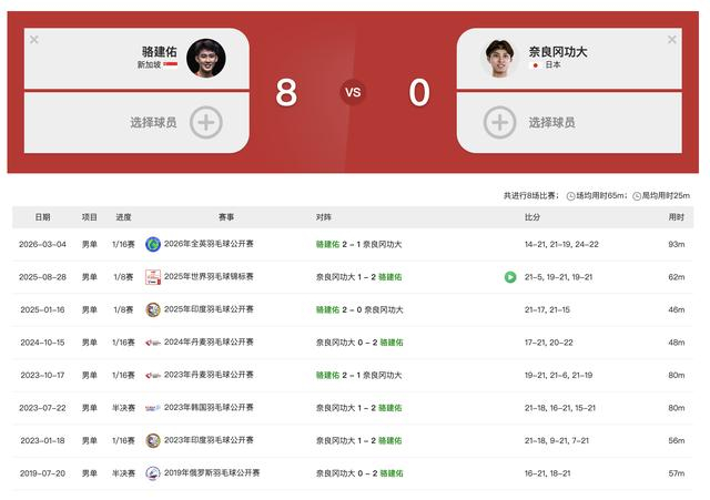 骆建佑首轮对手是日本名将奈良冈功大,两人激战93分钟,骆建佑在先丢一局的情况下,连扳两局逆转。奈良冈功大输掉本场比赛后,达成了“八败之交”。两人从19年俄罗斯公开赛半决赛首次交手到26年全英赛首轮对垒,奈良冈功大从未拿到过1场胜利,连输八场。